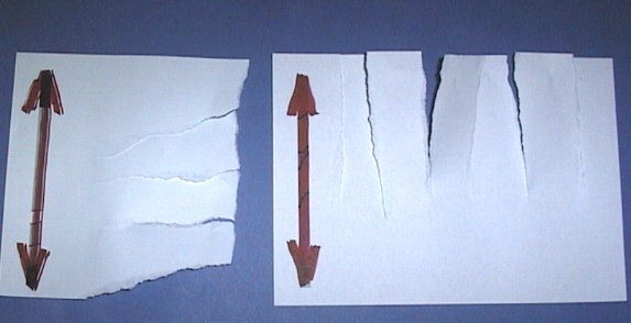 V smeri teka papirnih vlaken je rob trganja bolj raven. Papir se lepo